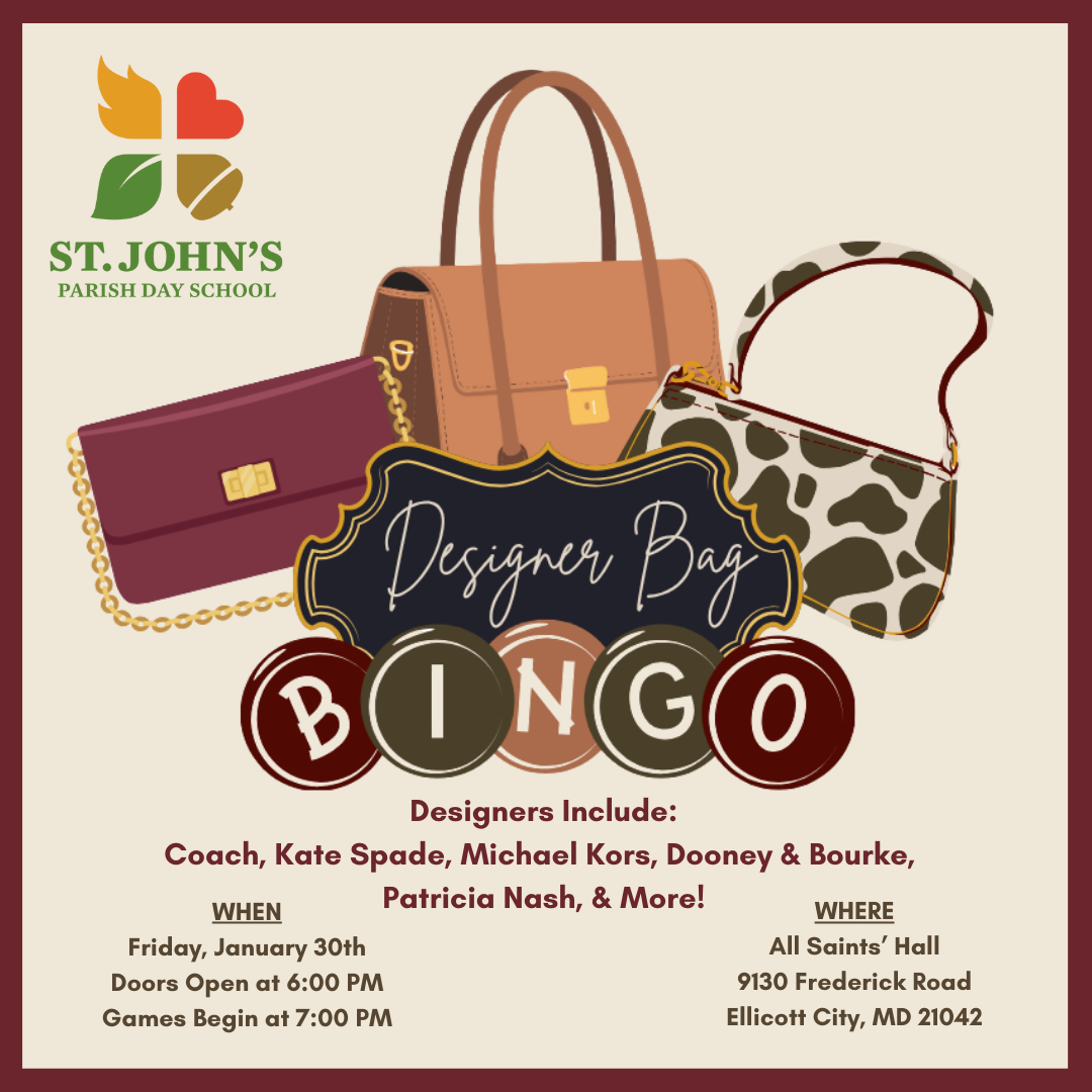 Join us on Friday, January 30th in All Saints’ Hall for St. John’s Parish Day School’s Designer Bag Bingo! Doors open at 6:00 PM, and games will start promptly at 7:00 PM! Gather your friends, pack some snacks, grab your favorite drinks (beer, wine, cocktails, soda, etc.), and get ready to shout BINGO! For more information on games, activities, bags, AND to purchase your tickets, click HERE!